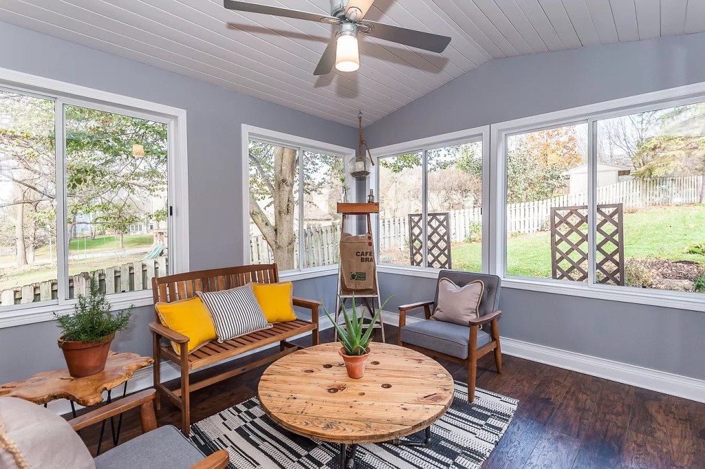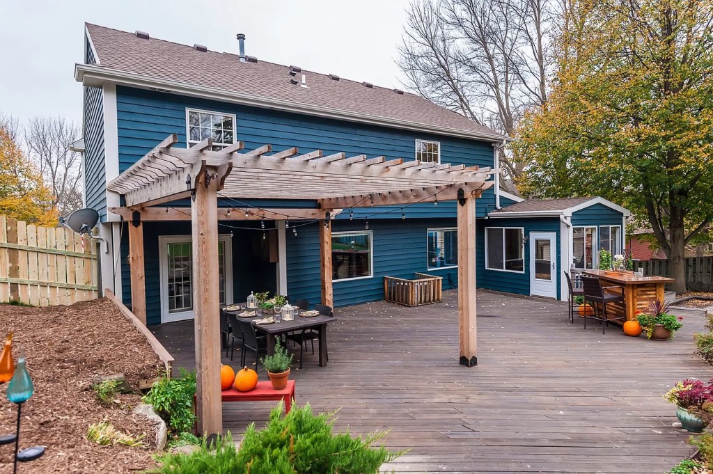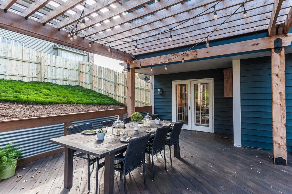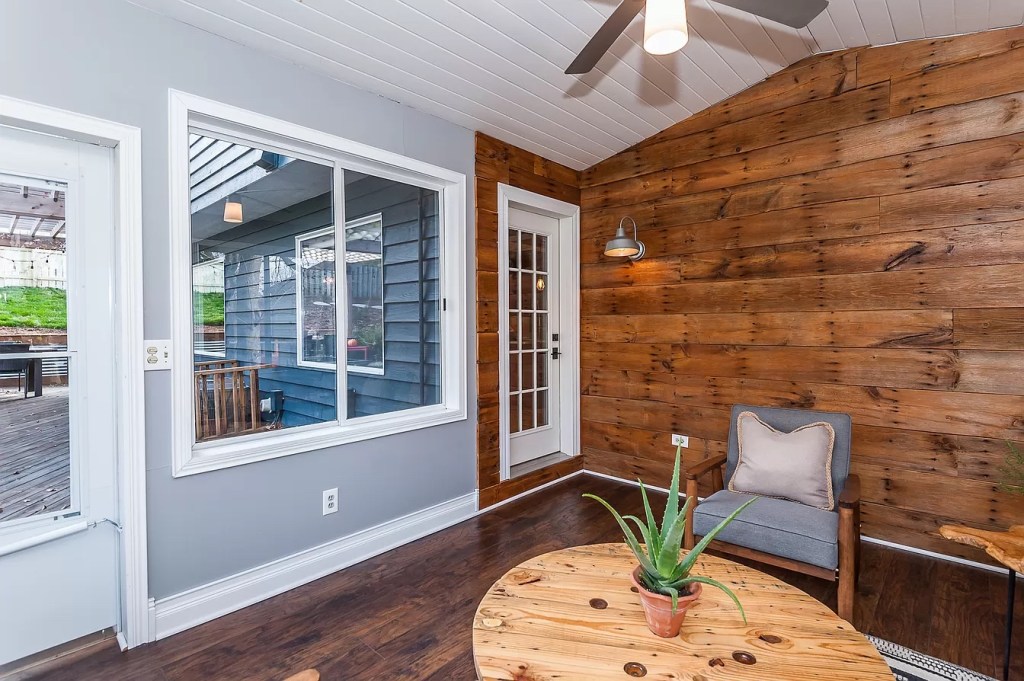 The small, 3-season porch felt old and cold. But, painting the cedar ceiling a bright white and pairing it with an industrial fan and warm LVP flooring with a reclaimed accent wall cozied this space right up! Outside, we built a welcoming outdoor dining area under a large cedar-tone pergola.