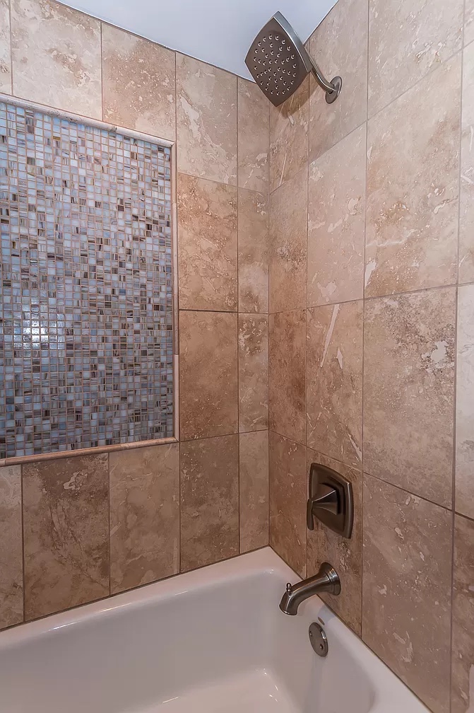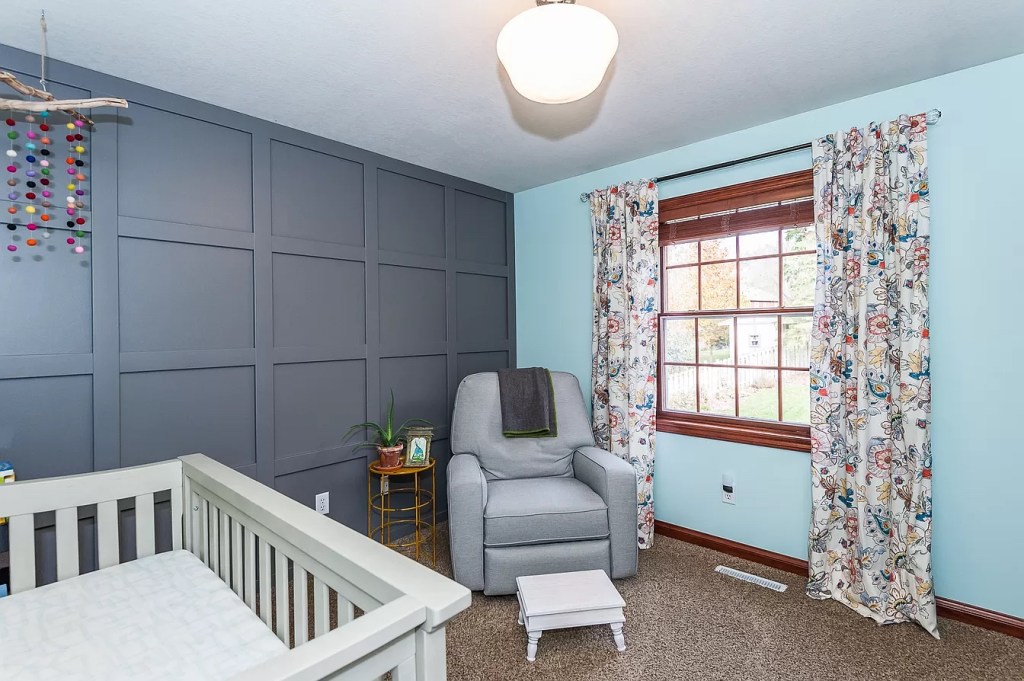 Old flooring and shower surrounds were removed in the primary, kids, and guest bathrooms to make way for new tiles. The composite counters were also replaced with granite, and the fixtures were swapped to give these spaces a fresh feel. In the nursery, we added a slat wall as a focal point and created more depth with paint.
