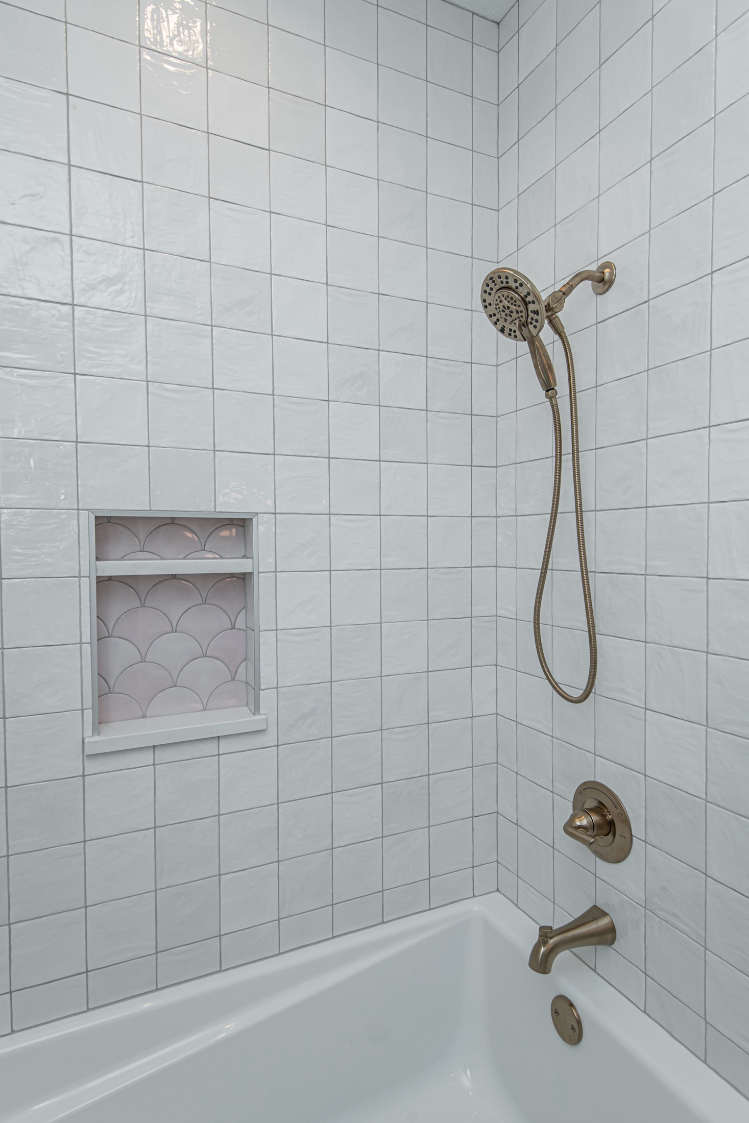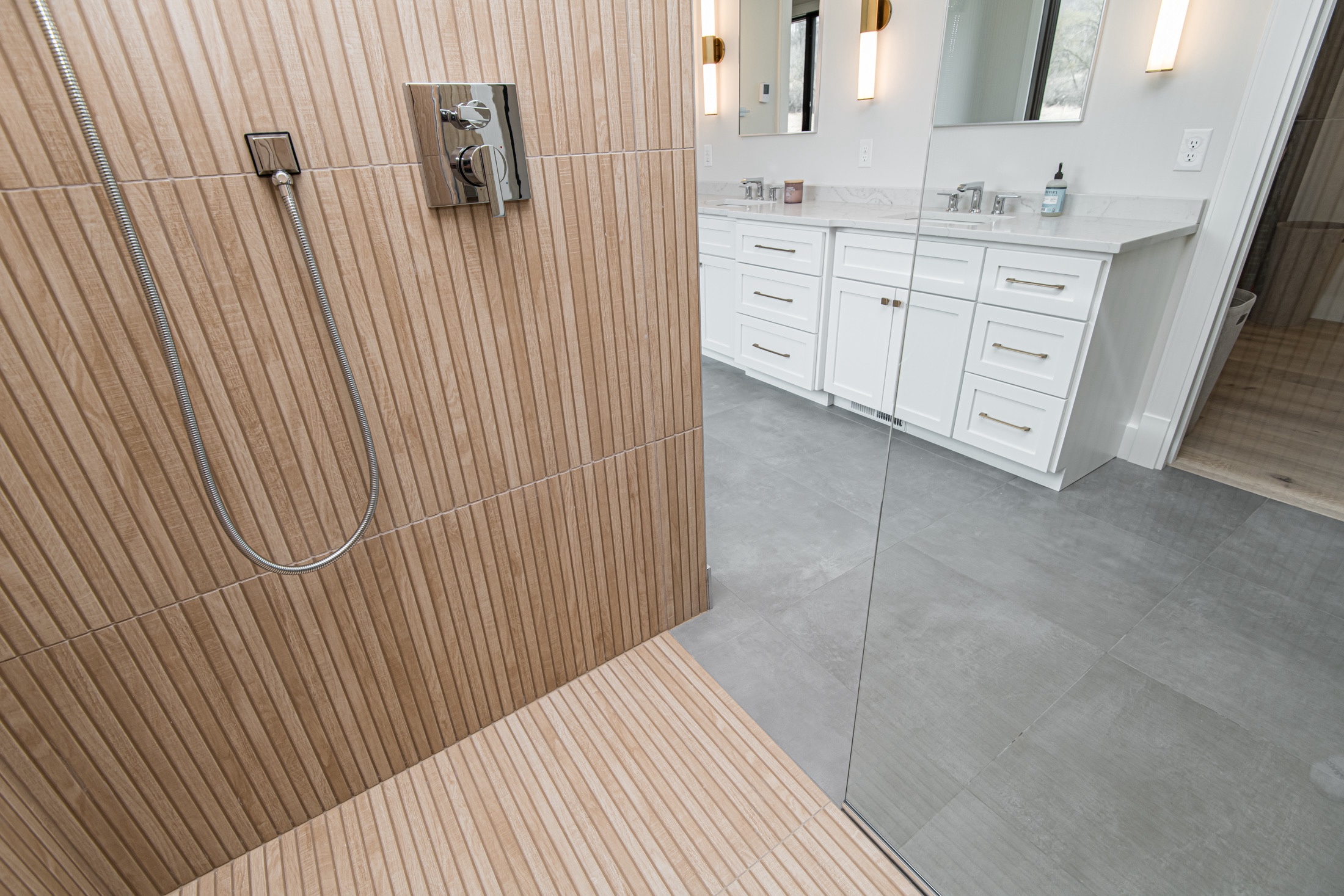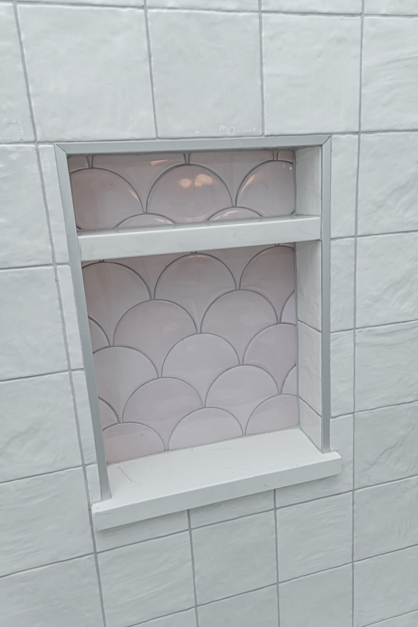Tile choice can be safe or bold. In our case, it’s a mix! We went for neutral silvers, blacks, whites, and concrete colors for most tiles, but opted for more unique collections on the walls. The Kenridge ribbon maple wood look in large format gave the primary and steam shower a spa-like feel. The Ivy Hill Beta Rose ceramic tile added a touch of femininity to our daughter’s niche, while the Imperial Slate Blue hexagon brought a splash of color to our boys’ shower. We love how tile can add movement and texture even in small spaces.
