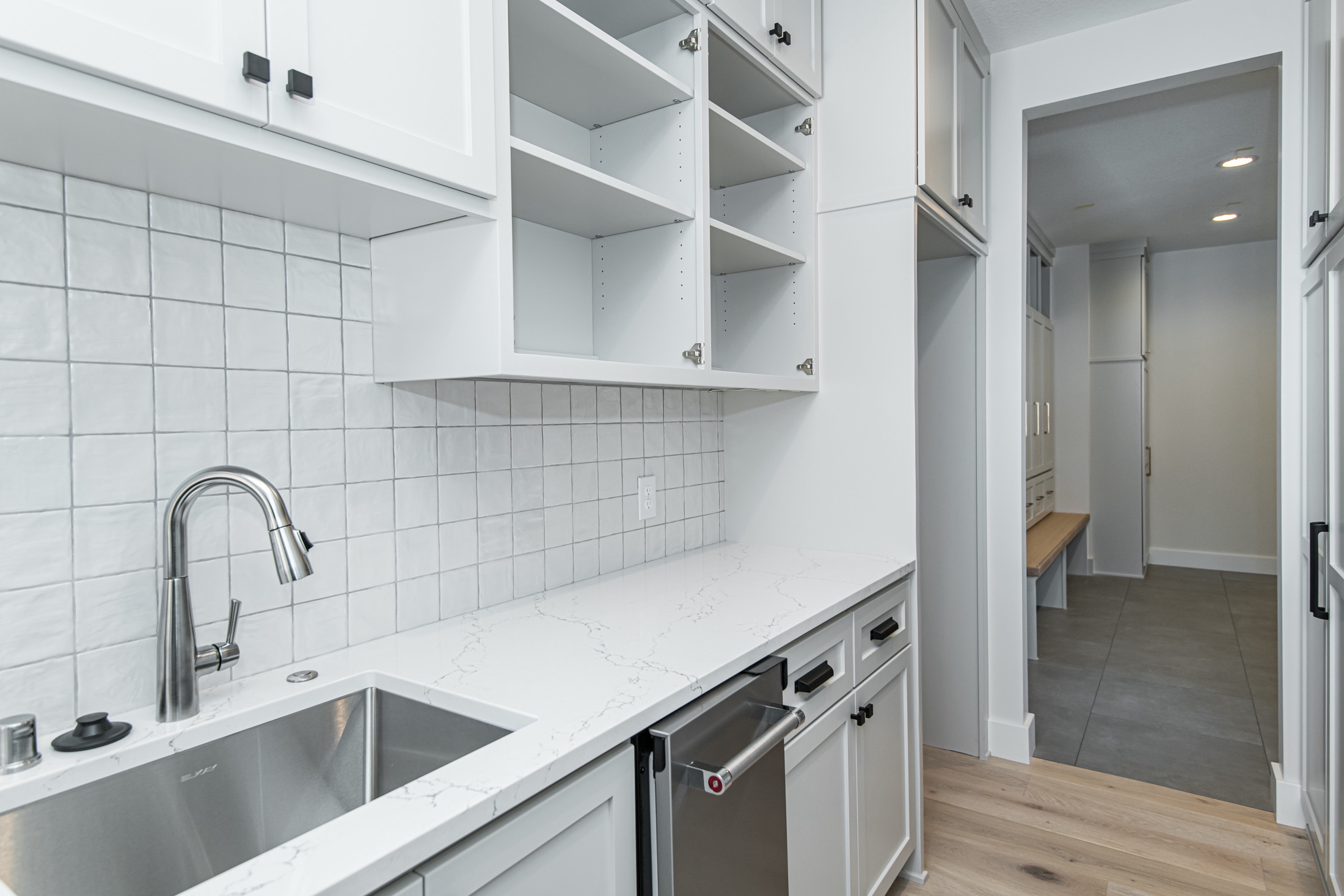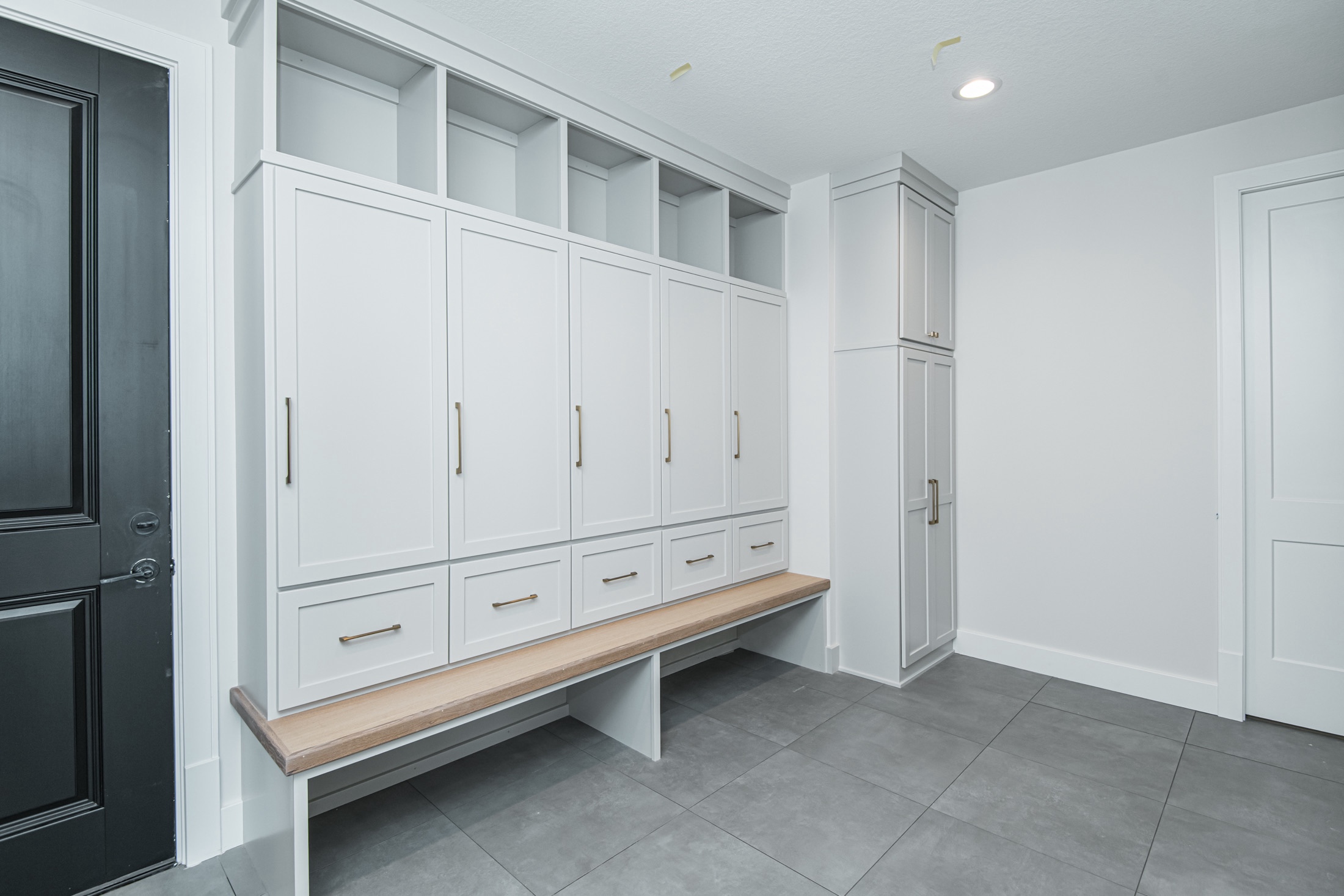 A big mudroom and laundry room with a walk-in closet is every mother’s dream. The custom built-in locker meets the needs of every on-the-go family … providing ample storage that hides all of the jackets, gloves, and shoes without sacrificing function.