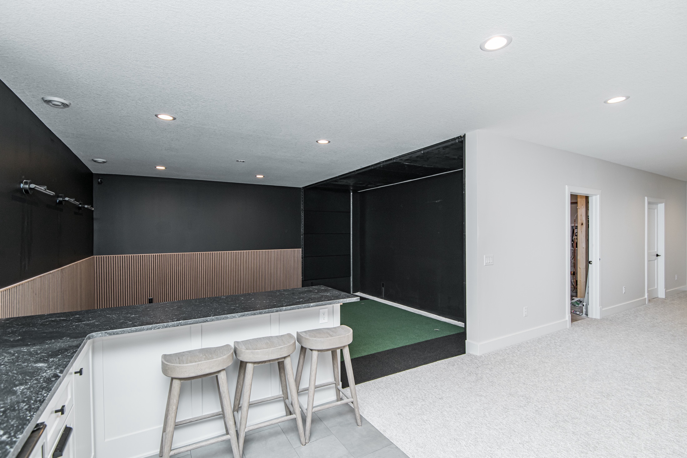 What’s become a family favorite is our custom simulator room that also serves as a cozy theatre for family time when the clubs are put away. It’s next to the basement living room which flows nicely for entertaining large groups. We wanted the golf space to feel intentional so we sourced black walnut paneling from Wood Panel Wall, which not only gives this space a warm, mid-century modern look but also acts as a soundproofing barrier.
