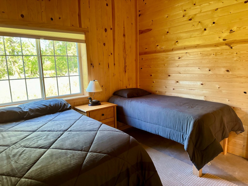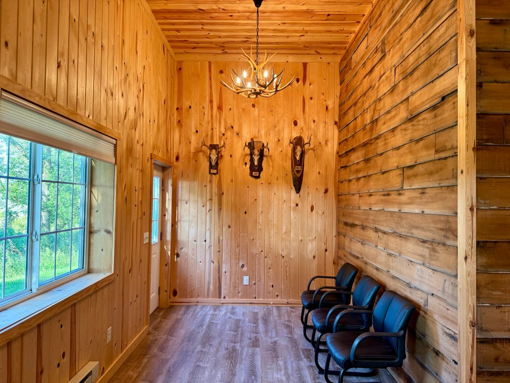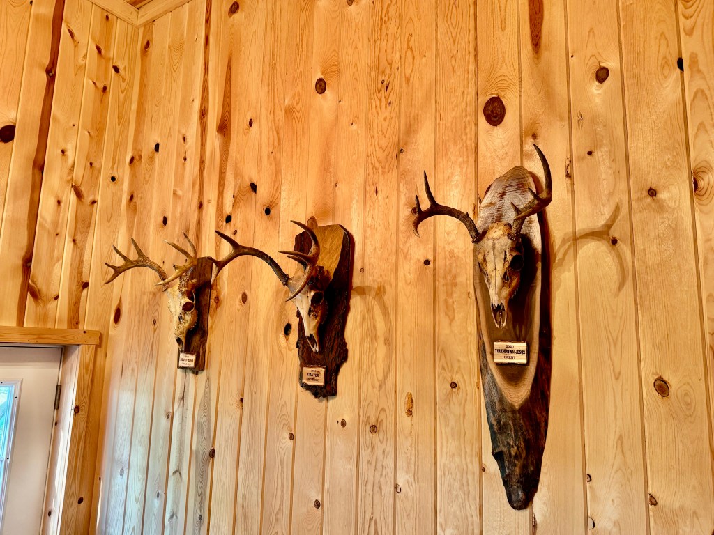The inside design feels grand yet modest. Hunters have plenty of wall space to display trophy mounts with ceiling heights soaring at 14 feet. We chose decor and fixtures to naturally reflect wilderness … animal prints, taxidermy, antler chandeliers, and family history. Even the bedding follows an outdoor theme!